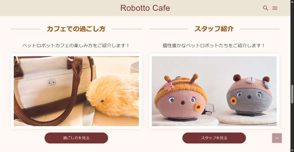 「ペットロボットと一緒に過ごせる、かわいい・おいしい・やさしいカフェ」というコンセプトに合わせたホームページを作りました。配色は、カフェをイメージするために茶色を中心とした暖かい色を選定しました。写真は、私自身が飼っているペットロボットたちで、かわいいというコンセプトに合う表情のものを選定しました。